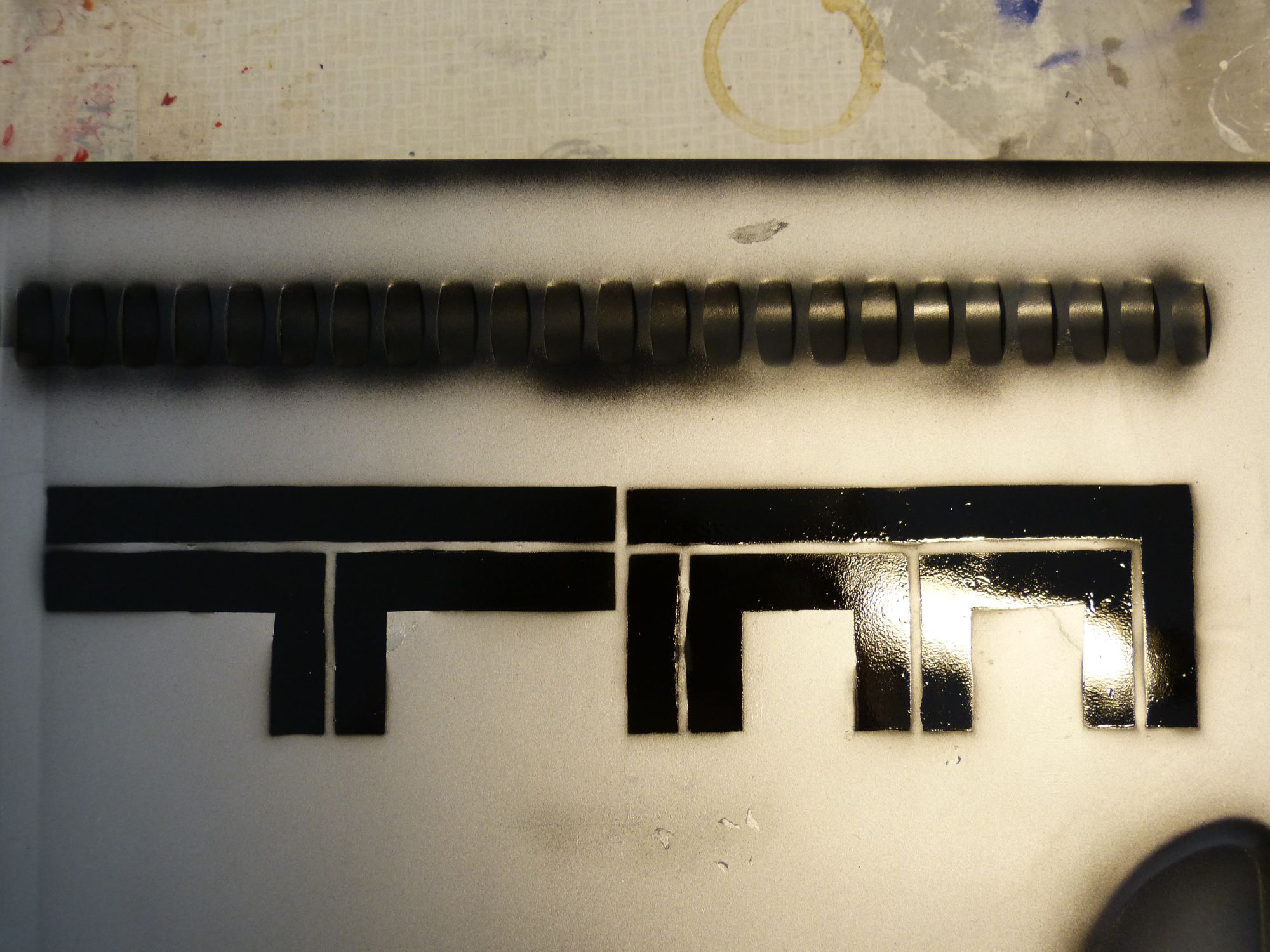 So sah der Tower nach einem Feinschliff und der Grundschicht Lack aus. Da sah der silberne Grund auch noch gut aus. Leider ging er mir dann noch aus, weshalb ich auch den schwarzen Streifen gemacht habe. Sieht aber so wahrscheinlich eh besser aus.