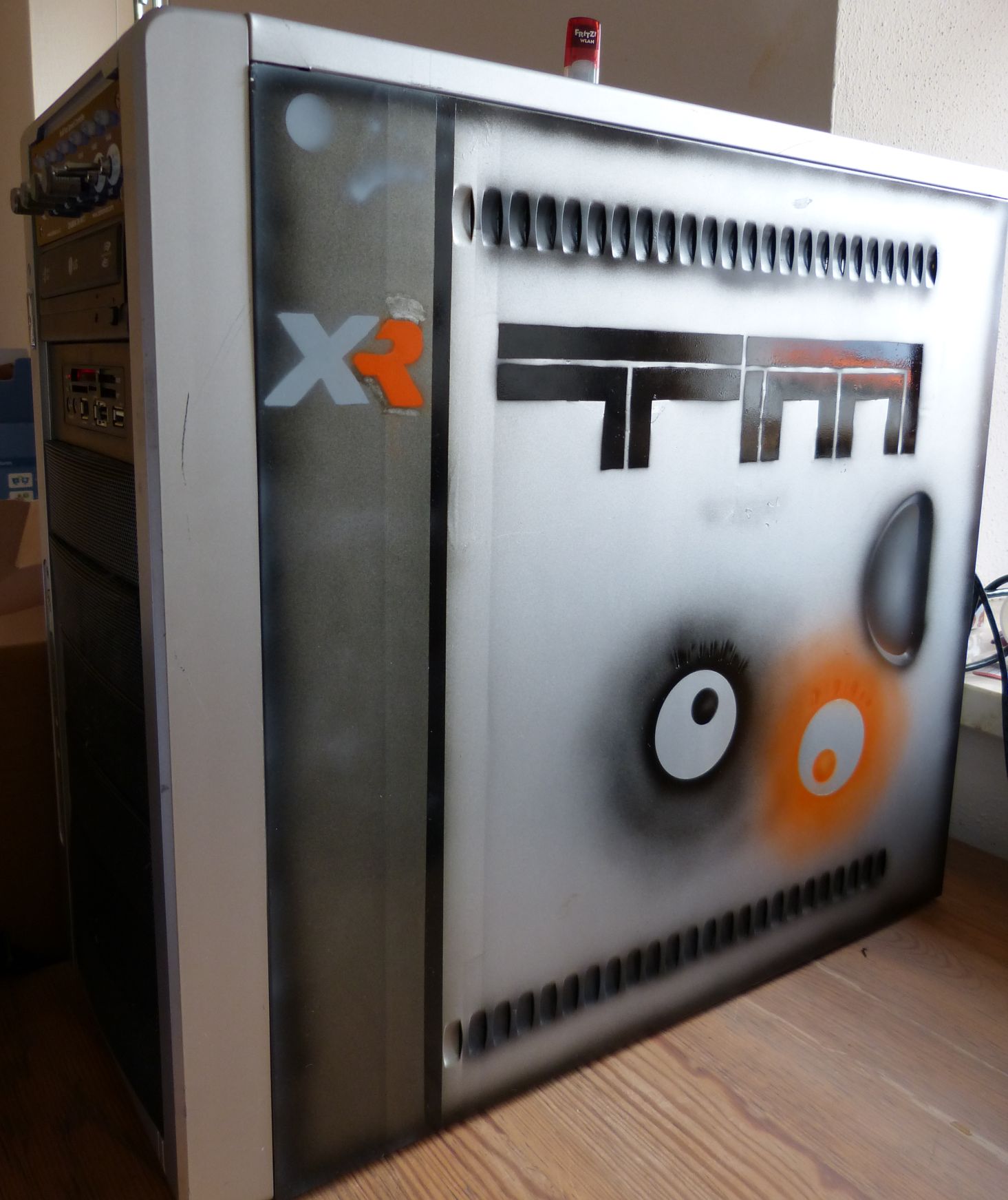 Kurzum: Ich bin trotzdem zufrieden. ^^ Immerhin habe ich jetzt den vermutlich weltweit ersten Tm-Airbrush-PC und auf jeden Fall den ersten mit XR-Logo ;-) Für meinen ersten Gehversuch auf diesem neuen Gebiet bin ich auch technisch einigermaßen zufrieden, vor allem da ich weiß, dass nicht alle Fehlerchen an mir, sondern vielmehr am Werkzeug und Material liegen. Das ganze hat auch gar nicht mal so lange gedauert. Hab gestern Abend um 5 damit begonnen und jetzt gerade ist er fertig geworden.