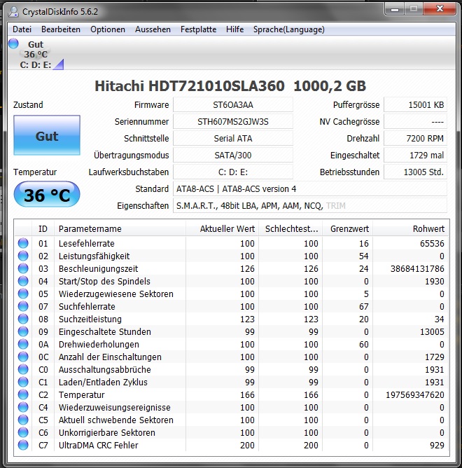 CrystalDiskInfo sagt mir, der Zustand meiner HDD sei immer noch GUT und auch die Werte scheinen nicht allzu schlecht: