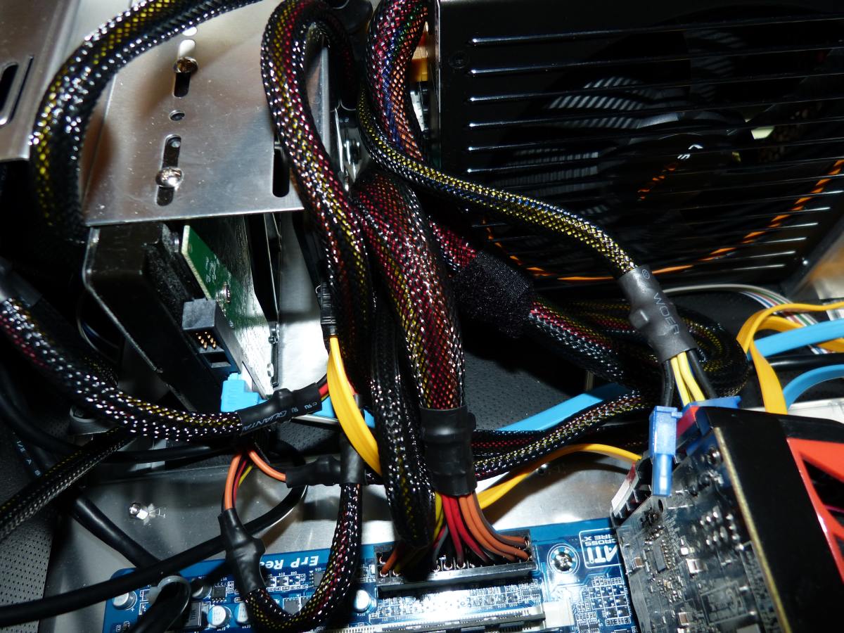 Das Gehäuse ist an und für sich relativ geräumig und bietet für (fast) alle Komponenten genügend Platz, einschließlich zwei Festplatten und einem optischen Laufwerk. Das "fast" ist allerdings auch das Problem: Mein altes Be-Quiet Dark Power Netzteil wollte mit seinen 18 Zentimetern Länge nicht an seinen Platz passen und musste draußen bleiben. Kurzerhand tauschte ich das Dark Power gegen das Straight Power meiner Freundin mit 15 Zentimeter Länge, das natürlich prompt den Geist aufgab (Never touch a running system!). Jetzt bin ich bei einem 16 Zentimeter langem Straight Power mit Kabelmanagment angelangt und es passt, wie auf den Fotos zu sehen ums Arschlecken gerade so rein. Mir egal, ich bin jetzt zufrieden, aber das ist tatsächlich ein Problem an dem Gehäuse, das ich so vorher nicht bedacht hatte.