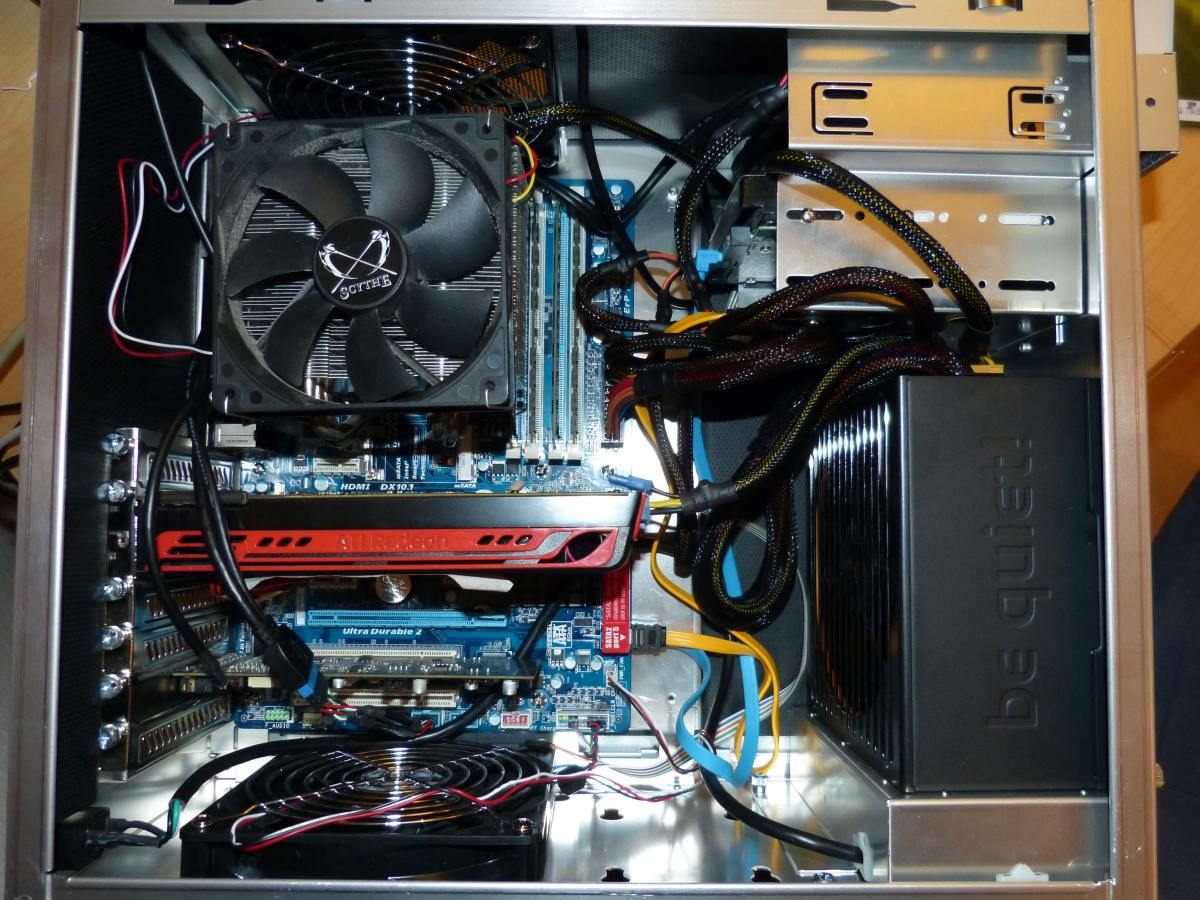 Das Gehäuse ist an und für sich relativ geräumig und bietet für (fast) alle Komponenten genügend Platz, einschließlich zwei Festplatten und einem optischen Laufwerk. Das "fast" ist allerdings auch das Problem: Mein altes Be-Quiet Dark Power Netzteil wollte mit seinen 18 Zentimetern Länge nicht an seinen Platz passen und musste draußen bleiben. Kurzerhand tauschte ich das Dark Power gegen das Straight Power meiner Freundin mit 15 Zentimeter Länge, das natürlich prompt den Geist aufgab (Never touch a running system!). Jetzt bin ich bei einem 16 Zentimeter langem Straight Power mit Kabelmanagment angelangt und es passt, wie auf den Fotos zu sehen ums Arschlecken gerade so rein. Mir egal, ich bin jetzt zufrieden, aber das ist tatsächlich ein Problem an dem Gehäuse, das ich so vorher nicht bedacht hatte.
